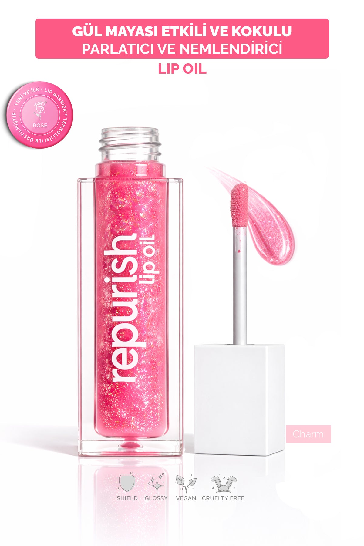 Repurish Gül mayalı simli formülü ve Vitamin E içeriğiyle dudakları nemlendirir, doğal parlaklık kazandırır ve dış etkenlere karşı korumaya yardımcı olur. Hafif ve yapışkan olmayan dudak bakım yağı.
